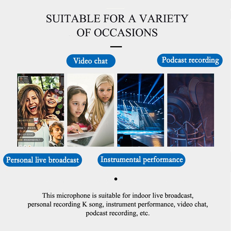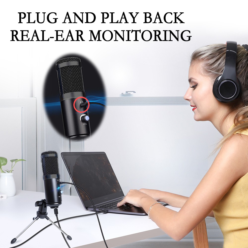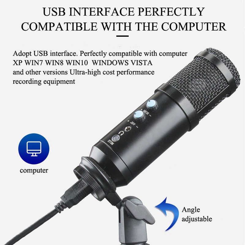 USB MicrophoneFeatures1. The microphone adopts DSP audio processing chip, which hashigher samplingrate and upgrades the sound. 2. High-sensitivity radio, precie recognition of every detail dio, preceog internal smart chip eftectively isolates noise and effectively reduces nois. 3. USB interface, perfect compatible with computer XP, win7, win8, win10, Windows Vista and other versions. 4. Heart-shaped pointing to the condenser pickup accurately capturing the vocal signal so that you can only record the pure sound. 5. Adjustable Volume, Convenient and Fast,With Foldable Iron Triangle Bracket. SpecificationsUse:Computer Microphone Set Type:Single MicrophoneStyle:Tabletop Transducer:Condenser Microphone Polar Patterns:CardioidCommunication:WiredPackage:Yes Model Number:UD-900FXPackage Include1 X Shock mount1X USB data cable1x microphone1 x tripod1 x instruction manual