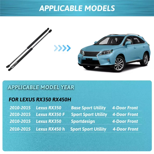 2PCS Front Hood Lift Support Gas Struts Shocks for Lexus RX350 RX450h 2010-2015. For 2010-2015 Lexus RX450h Base Sport Utility 4-Door Front. For 2010-2015 Lexus RX350 Base Sport Utility 4-Door Front. For 2010-2015 Lexus RX350 F Sport Sport Utility 4-Door Front. For 2010-2015 Lexus RX350 Sportdesign Sport Utility 4-Door Front. 2PCS Front Hood Lift Support Gas Struts Shocks for Lexus RX350 RX450h 2010-2015 Description Location:Front Bonnet Hood, Front Left and Right Condition: New Material: Spring steel Color: Black Placement on Vehicle: Front Left and Right Fits For 2010-2015 Lexus RX350 Base Sport Utility 4-Door Front For 2010-2015 Lexus RX350 F Sport Sport Utility 4-Door Front For 2010-2015 Lexus RX350 Sportdesign Sport Utility 4-Door Front For 2010-2015 Lexus RX450h Base Sport Utility 4-Door Front Interchangable with SG229046,534400W200,53440-0W200,534500E010 53450-0E010,53460-0E010,53440-0E020,6755,PM3269,534400E020 The Compatibility Is Just For Reference. Please Compare With Your Original One Before Purchasing! Package Included 2 * Front Bonnet Hood PaymentShipping & HandlingReturns PolicyContact USFeedbackPayment Shipping will be arranged only your payment is cleared. We accept payment by PayPal only . Shipping & Handling We ship the same business day if paid by 4pm EST(1pm PDT). We don’t ship to APO/FPO and Post Office box addresses, Alaska, Hawaii and Puerto Rico. No shipping on Weekend or Public Holidays & No responsibility for any customs duty. Returns Policy We offer a 60 day money back guarantee or exchange. Buyer pays return shipping and we pay replacement shipping. If you want to initiate a return,please contact us to get a returning address before sending the item back. Contact US We hope that every transaction can have a happy ending. And if you have any more problems, please feel freeeee to contact us. we’ll do what we can to help. Feedback We believe communication can result in a happier ending before you leave a red or gray feedback. And this account is my baby. I do care about it and will do what I can to protect it.