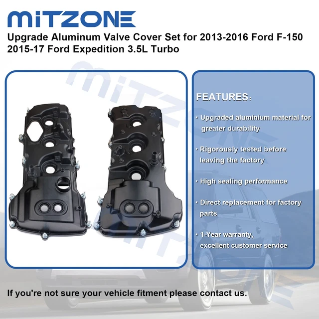 2x Valve Covers Set for 2013-2016 Ford F-150 2015-17 Ford Expedition 3.5L Turbo. 2pcs Aluminum Engine Valve Cover Set (Left & Right Side). At the top of the page, find theSelect vehicle button and add your vehicle to check if this part is fit for your vehicle and avoid unnecessary losses. Store category Sign Up Now ! You may also like 2x Valve Covers Set for 2013-2016 Ford F-150 2015-17 Ford Expedition 3.5L Turbo Product Description 【 Items Included】 2pcs Aluminum Engine Valve Cover Set (Left & Right Side) 2pcs Gaskets + Bolts (pre-installed) 【Part Number 】 BL3Z-6582-H DL3Z-6582-C 【Fitment】 3.5L V6 TURBOCHARGED ENGINE 2015-2017 FORD EXPEDITION 3.5L V6 TURBOCHARGED 2013-2016 FORD F-150 3.5L V6 TURBOCHARGED 2015-2022 FORD TRANSIT-150 3.5L V6 TURBOCHARGED 2015-2022 FORD TRANSIT-250 3.5L V6 TURBOCHARGED 2015-2022 FORD TRANSIT-350 3.5L V6 TURBOCHARGED 2015-2022 FORD TRANSIT-350 HD 3.5L V6 TURBOCHARGED 2015-2017 LINCOLN NAVIGATOR 3.5L V6 TURBOCHARGED Comptability Vehicle SHIPPING RETURN WARRANTY GENERAL Comptability Vehicle At the top of the page, find the Select vehicle button and add your vehicle to check if this part is fit for your vehicle and avoid unnecessary losses. Alternatively, you can send us the VIN number and we will help you check the fit. Please review our interchange above in the compatibility table to verify proper fitment of your vehicle. Keep in mind interchange tables apply only to American Market vehicles. If you live outside of the USA please research carefully and verify if it fits your vehicle before purchasing. Or just contact us for a quick response. SHIPPING Our orders shipped within 24 hours and always Free Shipping in MITZONE Auto Parts store. We shipping from the nearest available warehouse to you. Tracking numbers will be emailed upon shipment. RETURN Please contact us before returning items or leaving anthing but positive feedback. We are here to help you solve your problemes. 30 DAYS RETURN policy is guaranteed with any reason (We only warranty cost of parts. Any installation or other fees are non-refundable.). Our goal is to offer quality service and we want your transaction to go perfectly. We work hard for our every custmer’s smile and hope to do bussiness with you. WARRANTY We provide 1 YEAR WARRANTY of our product. Right parts, guaranteed. If you find any defects, let us know within 30 DAYS and we’ll take care of it. Please note: If there is a quality problem within half a year , you can get a replacement or a full refund ; If there is a quality problem in half a year to 1 year , you can get a replacement or a 50% refund . Any modifications to an item before contacting us will void all warranty coverage for this item. Please contact us before modifying the part so that we have the opportunity to correct the situation. GENERAL If you have a question about a part, just feel free to message us via eBay before buying. Ren Auto Parts is happy to offer you the best price and fastest service for all our customers. On Jan 11, 2024 at 17:32:36 PST, seller added the following information: