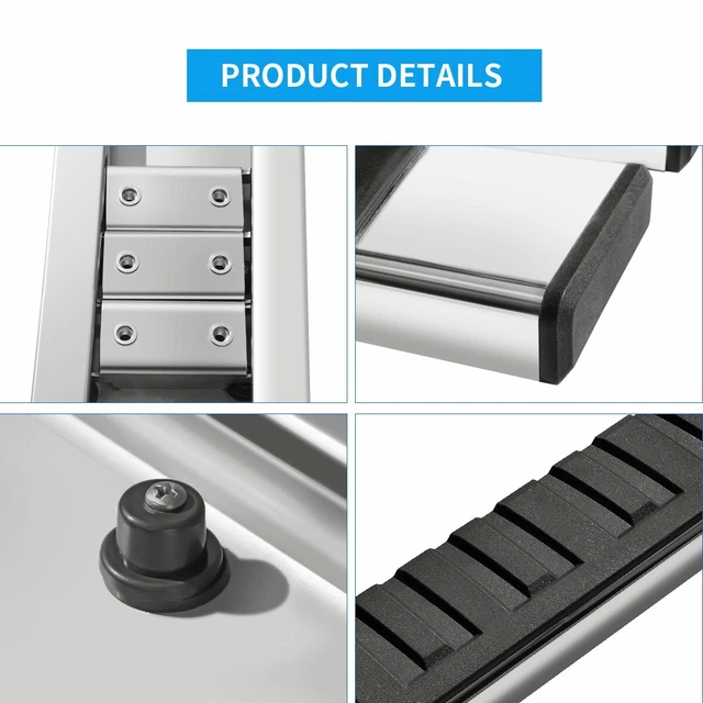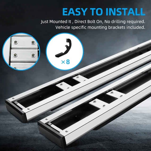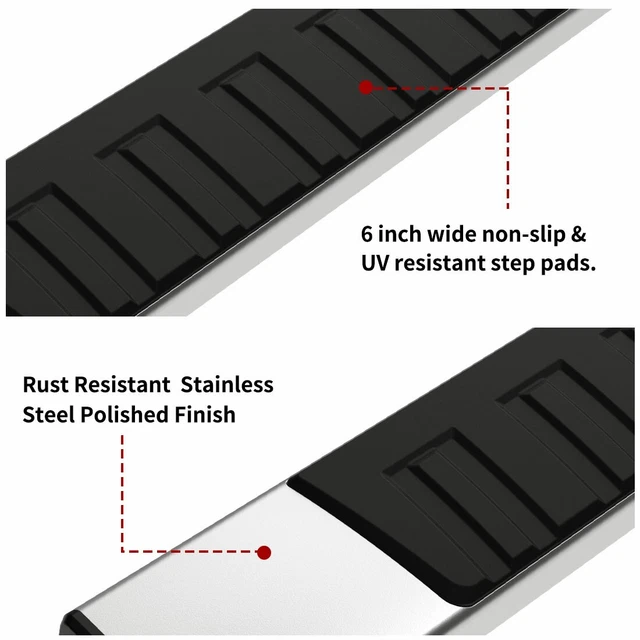 6″ Running Boards for 07-18 Silverado Sierra 1500 Crew Cab Nerf Bars Side Steps. Notfit for 2019 Silverado / Sierra 1500 Crew Cab. for 2007-2018 Chevy Silverado 1500 Crew cab models only. for 2007-2018 GMC Sierra 1500 Crew cab models only. for 2007-2019 Chevy Silverado 2500 HD/3500 HD Crew Cab models only. Item Description: Fits: for 2007-2018 Chevy Silverado 1500 Crew cab models only for 2007-2018 GMC Sierra 1500 Crew cab models only for 2007-2019 Chevy Silverado 2500 HD/3500 HD Crew Cab models only for 2007-2019 GMC Sierra 2500 HD/3500 HD Crew Cab models only NOTE: -Not fit for Diesel Models Equipped with DEF Tank -Not fit for 2019 Silverado / Sierra 1500 Crew Cab Package include: 2x Running Boards (Driver & passenger side) 1x Set (8pcs) Mounting Bracketsand hardware 1x Installation instruction Advantages: – Easy, No-Drill Installation Bolts Right To Factory Mounting Points In Less Than An Hour (Most Models) – 6 inches wide non-slip running boards can help the elderly, children and women get in and out of the vehicle safely and easily – Built From Durable, Rust-Resistant Stainless Steel structure and Large Slip-Resistant ABS Step Pads -Stylish Look- Built for prestige and elegance; Along with the pleasing aesthetic – Running boards will also protect doors and side panels by deflecting road debris kicked up by wheels – Repeatedly tested to ensure corrosion resistance even against salt sprays; Also counters ultraviolet radiation without discoloration More Display: On Oct 19, 2023 at 20:56:16 PDT, seller added the following information: On Oct 23, 2023 at 04:36:49 PDT, seller added the following information: On May 14, 2024 at 20:42:22 PDT, seller added the following information: On Jun 3, 2024 at 22:42:13 PDT, seller added the following information: On Jun 11, 2024 at 12:26:44 PDT, seller added the following information: On Jul 16, 2024 at 21:12:43 PDT, seller added the following information: On Aug 6, 2024 at 22:16:20 PDT, seller added the following information: On Aug 22, 2024 at 05:52:51 PDT, seller added the following information: On Oct 7, 2024 at 19:26:03 PDT, seller added the following information: On Oct 8, 2024 at 02:59:35 PDT, seller added the following information: On Oct 11, 2024 at 22:07:07 PDT, seller added the following information: On Oct 21, 2024 at 04:37:52 PDT, seller added the following information: