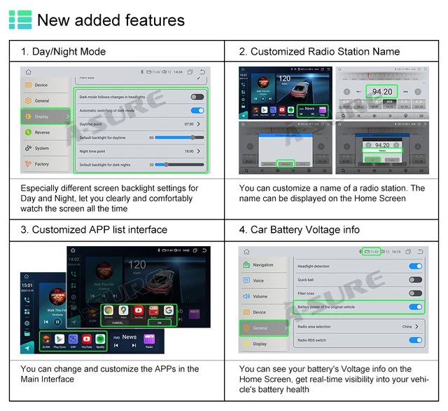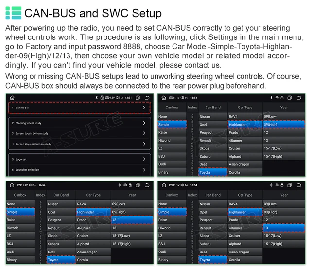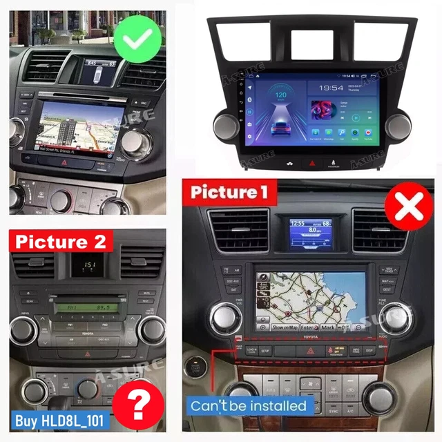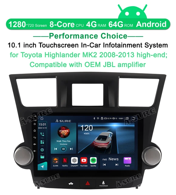 8 Core 4+64GB Carplay Stereo Radio for Toyota Highlander 2008-2013 Android 13. By simply speaking the command, the radio can quickly respond and perform the corresponding operation. RAM & ROM: 4GB / 64GB. Toyota Highlander 2008-2013 high end with JBL amplifier. Audio Output Mode: Stereo. Fit for: Toyota Highlander 2008-2013 high end with JBL amplifier (Kindly check the center console prior to purchase, pay attention to the harzard light panel difference) Description: CPU: 8 Core RAM & ROM: 4GB / 64GB Screen Size: 10.1 inch Screen Resolution: 1280 x 720P Operating System: Android 13 Map Type: Worldwide Audio Output Mode: Stereo Connectivity Technology: Bluetooth, Wi-Fi, USB, 4G LTE Included Components: Wiring harness, Frame, Screen Main Features: · Exclusive UI: Upgrade version with simple user interface, easy to operate. · RAM & ROM & CPU: Android 13 car stereo system, enjoy faster running with 4GB RAM and a 8 core CPU and 64GB ROM for more apps installed. 1280×720 IPS touchscreen with a full-viewing angle can allow clear viewing even in any position, making the color richer and the display clearer. With the split-screen function, you can enjoy both views on the same screen at the same time. · CAN BUS: Support displaying climate control infomation, vehicle information, etc · Retains SWC Functions : Steering wheel controls allow the driver to easily operate the vehicle’s multimedia system, telephone, navigation, and other functions via buttons on the steering wheel or the touch screen while driving without having to distract their attention from touching other locations. · Support Back up Camera: The rear view feature e nables real-time monitoring by providing a wider and clearer field of view, reducing blind spots, and lowering wind resistance. Safe assurance when parking. · Wireless Apple Carplay & Android Auto: Simply pair your mobile phone with your car radio for seamless connectivity. With the voice assistant, drivers can easily control music playback, navigation, phone calls, and other functions. By simply speaking the command, the radio can quickly respond and perform the corresponding operation. This intelligent interaction not only improves driving safety but also gives drivers a more convenient driving experience. · DSP: DSP can precisely adjust audio signals through digital processing, including equalization, delay correction, phase adjustment, etc., to optimize sound quality and spatial effects. It can realize multi-channel processing such as stereo, surround sound, and virtual surround sound effects to enhance the immersion and realism of the audio. · GPS navigation : Our radio comes with Google maps, the navigation can also work offline, the offline navigation software is not included, you can download it from Google Play store. · Support ChatGPT : As an AI system, ChatGPT can provide services anytime and anywhere, regardless of time and place. It can respond instantly to user questions and requests, tailoring responses according to the needs and context of the conversation to make each interaction more personal and relevant. · USB cables : Support external USB flash drive to upload music, photos and files. Supports Boot Screen Logo customization. · Wifi+Cellular : Support 4G SIM Card, you can use wifi, hotspot and mobile cellular network. · Support Mirror Link · Support Netflix and Youtube · Built-in Bluetooth hands free call
