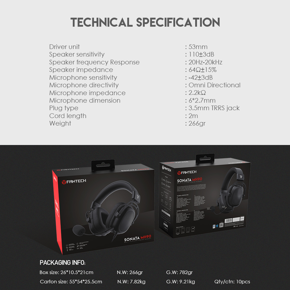 Fantech MH90 Sonata Adjustable Headband Detachable Microphone Gaming Headset Headphones Noise CancelSONATA MH90 MULTI-PLATFORM GAMING HEADSETSpeaker Driver: 53mmMemory Foam DetachableMicrophone Lightweight & DurableMulti-Platform CompatibilityAdjustable Earcup AdjustableHeadband Compatible with PlayStation 4, Xbox One, Nintendo Switch, and mobileChannel Stereo 3.5mm Gaming HeadsetIllumination No Remote ControlIn-line Remote Core Construction ABS Plastic + AluminumWeight 266gr (without cable)Connector Type TRRS + USBCable2.2mm Nylon braided cableDetachable Cable No DetachableMicrophone YesMicrophone Frequency Response 100-10,000HzMicrophone Pattern Omni DirectionalMicrophone Sensitivity -42dBMicrophone Impedance 2200 OhmMicrophone Noise Cancellation YesMicrophone Design FlexibleMicrophone Mute Toggle On Remote Control