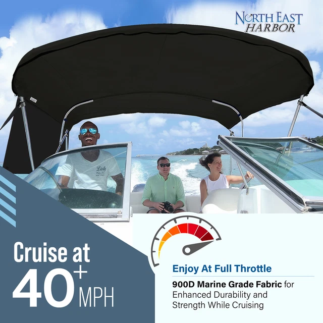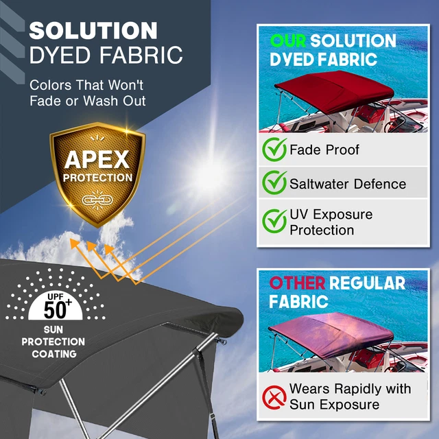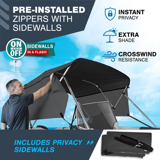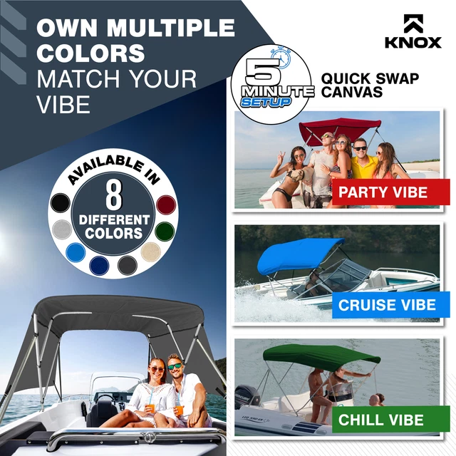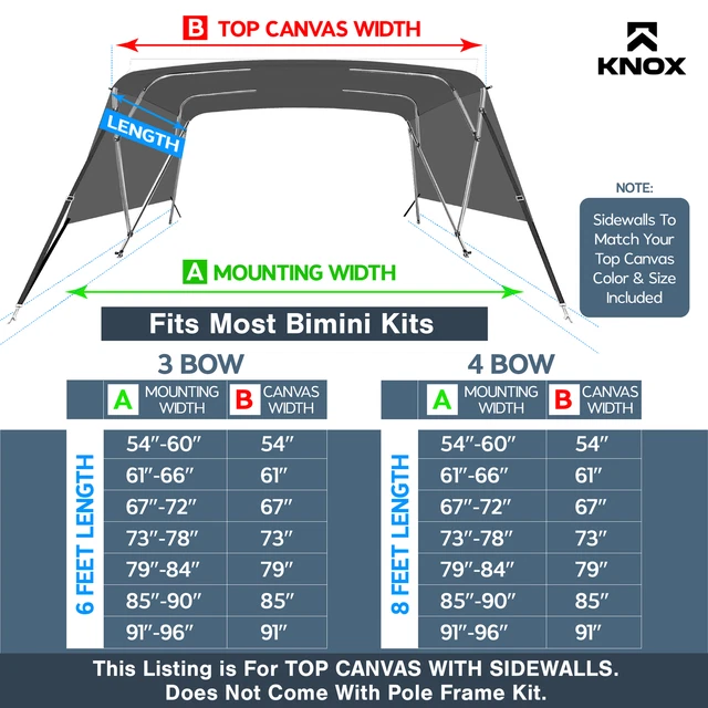 High-Quality Boat Bimini Top Marine Canvas Replacement + Side Walls, 900D Canopy. [INCLUDES PREMIUM BIMINI TOP BOOT] – A matching colored Bimini cover boot is included with our 3-bow and 4-bow size Bimini canopy for boat. This allows for easy and compact storage of the pontoon Bimini cover when not in use. Variation Listing: This is a variation listing, please select the exact style, size, and/or color that you would prefer. This can be selected from the dropdown menu above. If no options are available please see the “Item Specifics” above to see what style, size, and/or color this listing is for. High-Quality Boat Bimini Top Marine Canvas Replacement + Side Walls, 900D Canopy KNOX Universal 3 Bow / 4 Bow Bimini Top Replacement Canvas & Detachable Sidewalls with Storage Boot, 900D Marine Grade Sun Shade Boat Canopy with Solid or Mesh Side Blocks, No Frame Features: [UNIVERSAL CANVAS & SIDEWALL REPLACEMENT] – KNOX’s universal Bimini top replacement canvas and side walls can be installed on any 3 bow or 4 bow Bimini top frame in minutes. Our durable 900D marine-grade boat cover fabric has undergone vigorous environmental testing to ensure the ultimate waterproof, fadeproof, and tearproof protection. The extended grip sleeve and patent-pending hook-and-loop straps securely hold our Bimini top cover with side walls in place on any boat. (*Frame not included.) [SIDEWALLS FOR PRIVACY, SHADE AND CROSSWIND] – The sidewalls that come in KNOX’s 3 bow and 4 bow sailboat Bimini side shade package are great for elevating your boat enclosure to provide complete shade, privacy, and crosswind resistance. Our versatile design and snag-free zippers allow you to detach one side wall or remove both side panels with ease. Upgraded to give you more choice to customize your Bimini with sides, KNOX’s boat Bimini top cover is now offered with mesh sun shade side covers. [COLORS THAT NEVER FADE] – The boat cover material of our 3 bow and 4 bow Bimini top canvas and side blocks is solution-dyed for high colorfastness. This means that our Bimini top for boat won’t fade, retaining color vibrancy and pristine appearance. Our pontoon boat Bimini cover, storage boot, and Bimini top side curtains are made of durable 900D marine-grade fabric, triple fortified with waterproof, fadeproof and tearproof treatments to provide impenetrable protection for years. [QUICK SWAP CANVAS] – Own multiple colors, swap them easily to match your vibe. With eight solution-dyed colors and quick swap design, our 3 bow and 4 bow Bimini replacement canvas allows you to personalize your boat in minutes. Go with bold colors for those fun occasions when you want to give off a party vibe. On relaxed days when your boat is mooring, change your boat Bimini top cover to a color that fits a chill vibe. Enjoy customization to the fullest by owning an array of boat canvas colors. [INCLUDES PREMIUM BIMINI TOP BOOT] – A matching colored Bimini cover boot is included with our 3-bow and 4-bow size Bimini canopy for boat. This allows for easy and compact storage of the pontoon Bimini cover when not in use. The marine-grade fabric and zipper of the Bimini boot ensures effective dustproof and waterproof protection of our Bimini covers for boats. The zip-on boat top storage boot wraps tightly around the Bimini top replacement cover to secure it from flapping around when in tow. Specifications: Canvas Material: 900D Oxford Polyester Brand: KNOX Condition: 100% Brand New Package Includes: 1x Bimini Top Canvas 2x Side Wall Canvas 1x Zippered Boot Determining The Correct Size to Purchase: Using a measuring tape, decide which length top provides the desired amount of shade coverage for your boat. The pivotal mounting point will be approximately at the center point of the top on each side of your boat. After determining where the pivotal mount location will be on each side of the boat, measure the distance between these mounting points to determine the width you need. While standing inside the boat, measure from the pivotal mounting point straight up to determine the desired height. California Customers: ⚠️WARNING!: This product may contain chemicals known to the State of California to cause cancer, birth defects or other reproductive harm. For more information go to P65Warnings.ca.gov TRADEMARK INFORMATION: All trademarks, trade names, or logos mentioned or used are the property of their respective owners. The product being sold in this listing is not DOT approved unless otherwise stated. All goods sold are not DOT approved, they are for off road use only. Laws concerning this product vary from state/province to state/province. Your state/province may prohibit its use on public roads or restrict its use to novelty, show use, off-road areas, or race facility areas only. In some states/provinces off-road uses are also prohibited. The manufacturer and retailer assume no responsibility for any use or application of this product in violation of any applicable law. Before installing this product, please check your state/provincial and local/municipal laws and regulations.