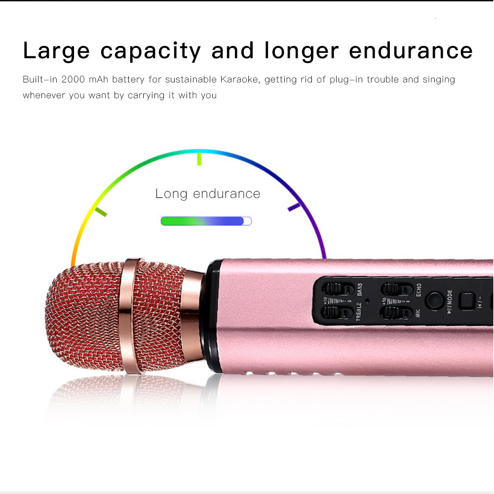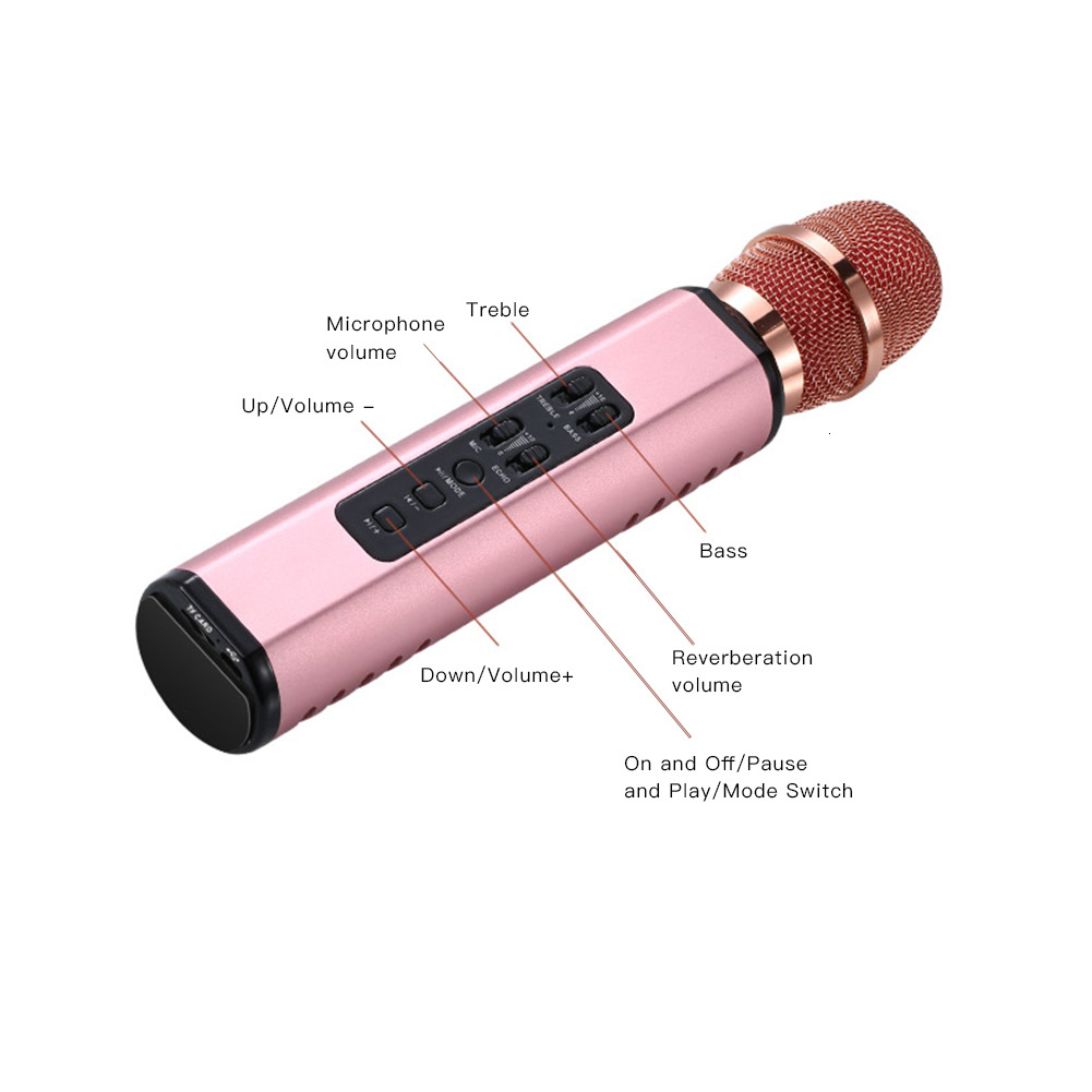Features:With speaker box + Karaoke microphone integration for Bluetooth connection, wireless singing, and surround sound, you can sing whenever you want to sing.Built-in listening chip allows you to listen to music while singing, deduce a variety of musical experience, and have different Karaoke fun.Built-in dual magnetic high fidelity loudspeaker with 5W*2 power, dual power amplifier with diaphragm, stereo surround sound; built-in equalizer for treble assistance and bass coordination.Built-in 2000mAh lithium-ion battery with extended working hours and low heating.It can filter external electromagnetic interference, effectively prevent microphone spraying sound, support Bluetooth and F card, and it is compatible with multiple formats with unlimited use and more humane operation.Package:1* Bluetooth microphone1* Aux line1* charing line1* retail boxSpecification:Pickup: condenser microphoneReverberation mode: echo reverberation regulationCharging voltage: DC 5VPower supply mode: built-in polymer lithium batteryMaterial technology: aluminum alloy + ABS baking paintNet weight: about 0.3KGProduct size: about 240X48MM/9.45*1.89in
