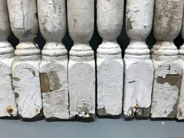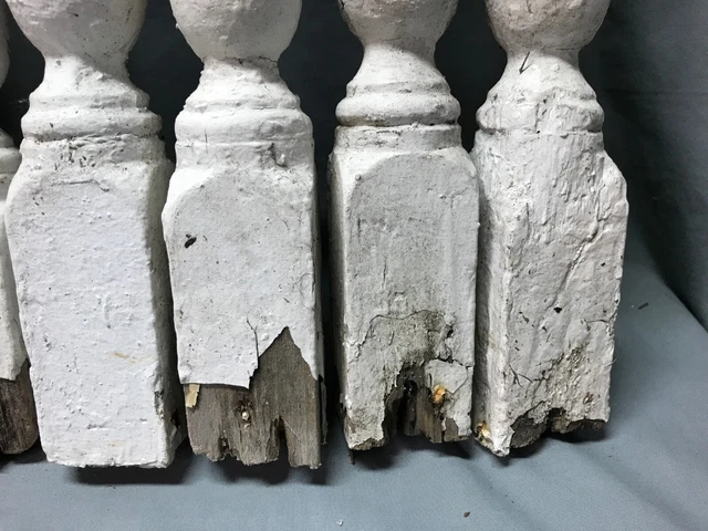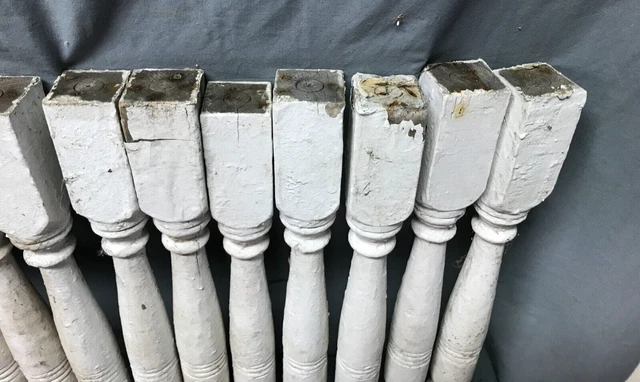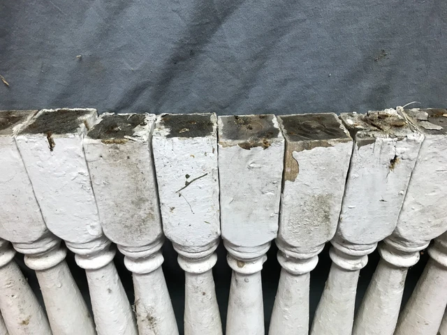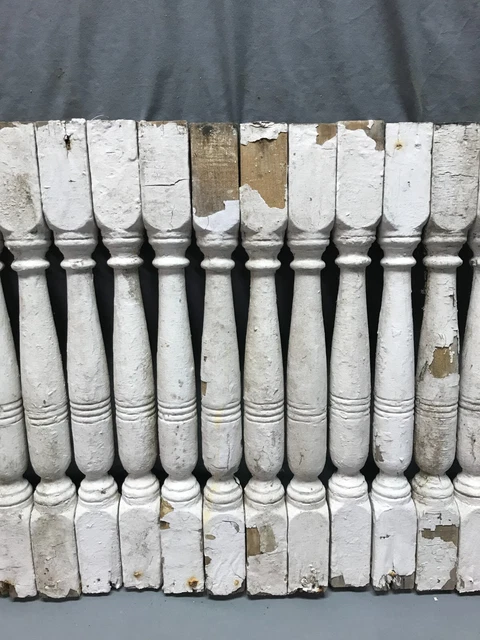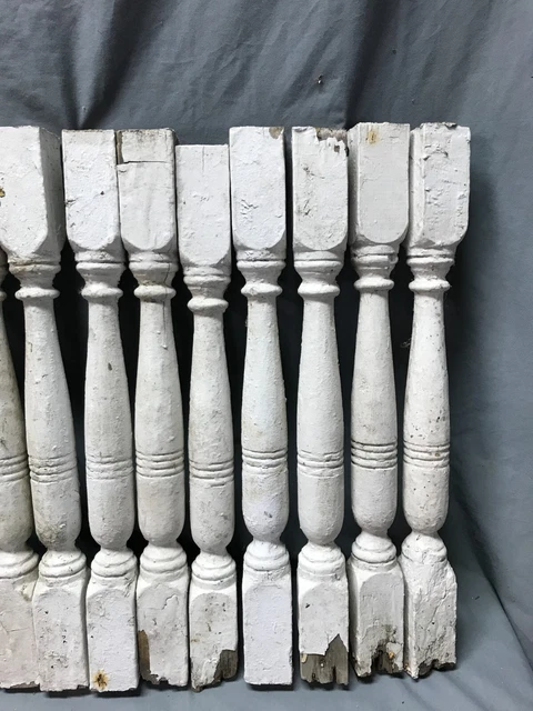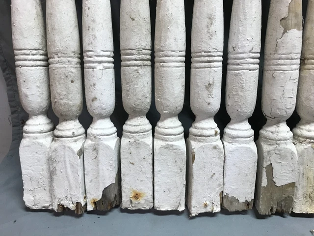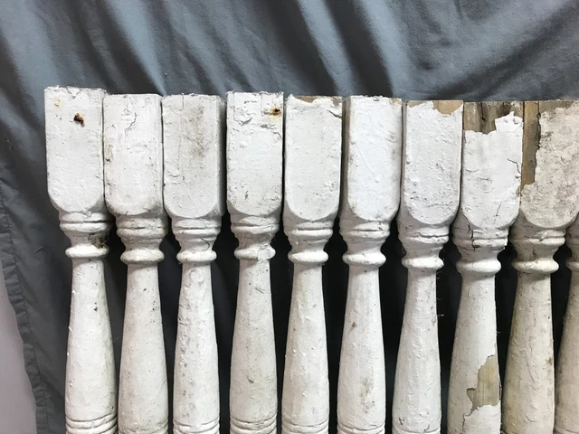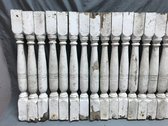 Lot of 34 Antique VTG Shabby White 2×20 Wood Porch Spindles Chic Old 1046-24B. This is for a lot of 34 antique salvaged turned exterior wood porch spindles. The wood is unknown. They are salvaged spindles so dirt, nails, nail holes, minor splits and checks should be expected. This is for a lot of 34 antique salvaged turned exterior wood porch spindles. The wood is unknown. They are salvaged spindles so dirt, nails, nail holes, minor splits and checks should be expected. The spindles are in a shabby flaky chipped white finish. Expect loose paint chips during shipping. They do have clipped nails on some ends. They are all matching in style. They have nice decorative turnings with beaded centers. Great for custom table, stool legs or for a porch restoration. Overall good solid condition. Please look over the pictures below and ask questions when needed. Thanks for your interest. Measures approx. – 1 3/4″ diameter Sq. ends x 20″ lengths